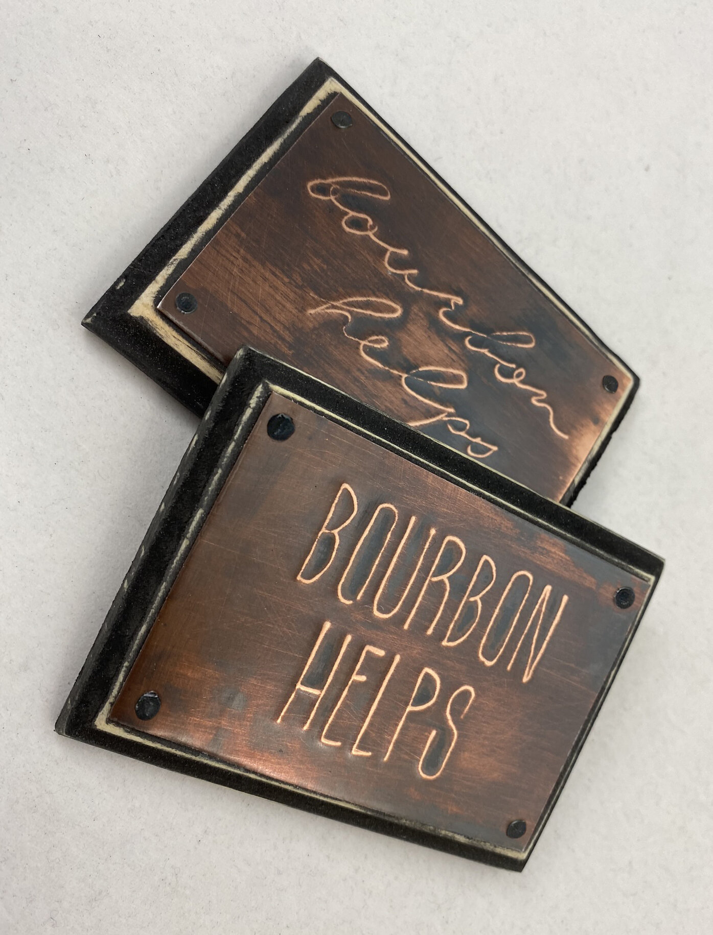 All these copper signs are custom made, hand drawn, hand cut and assembled, mounted on black distressed wood,