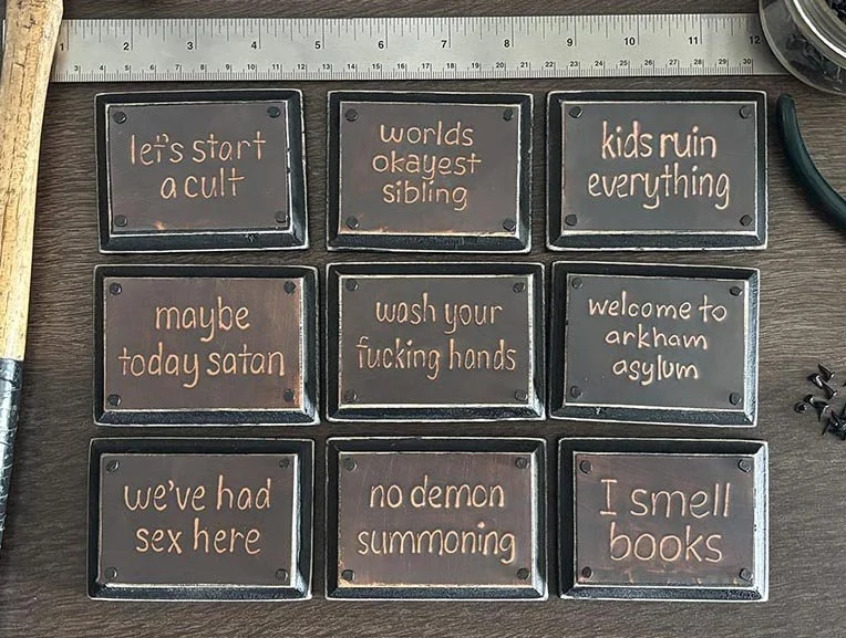 As for my copper, it’s described as “cheeky and geeky”, I hand draw snarky and funny sayings, fandoms and classic imagery onto thin sheets of copper. All antiqued, sealed and mounted on hand cut, painted and distressed beveled wood (all cut by my retired general contractor of a father) or framed.